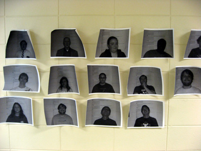 壁一面に貼られた囚人たちの写真を見て、