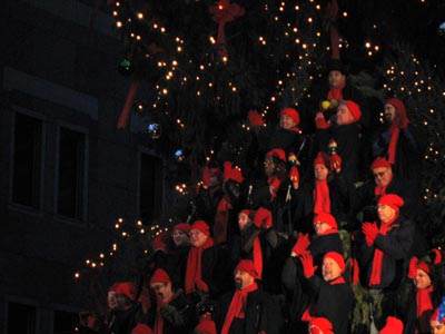 クリスマスツリーの中で歌うコーラス隊。